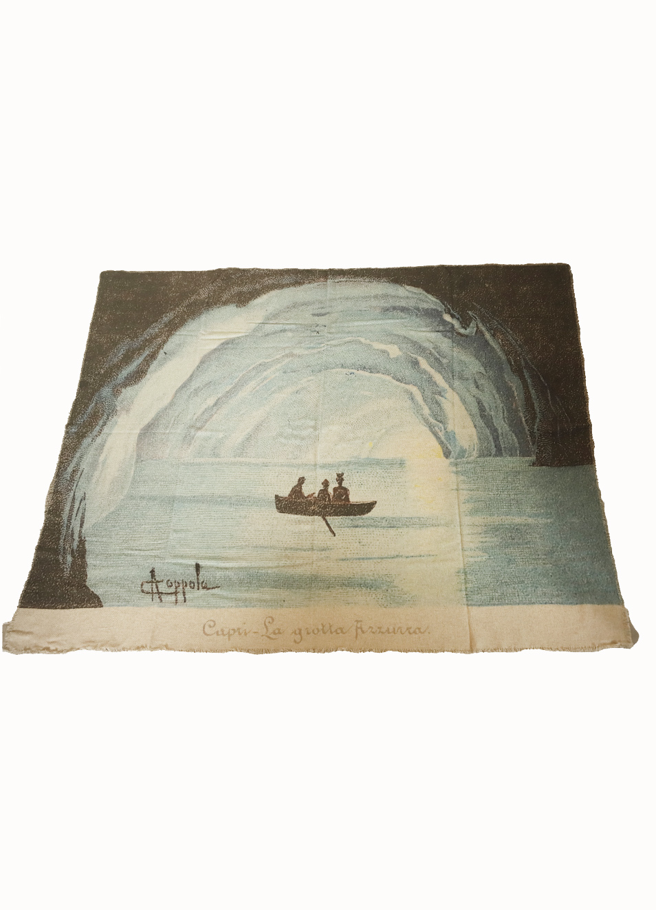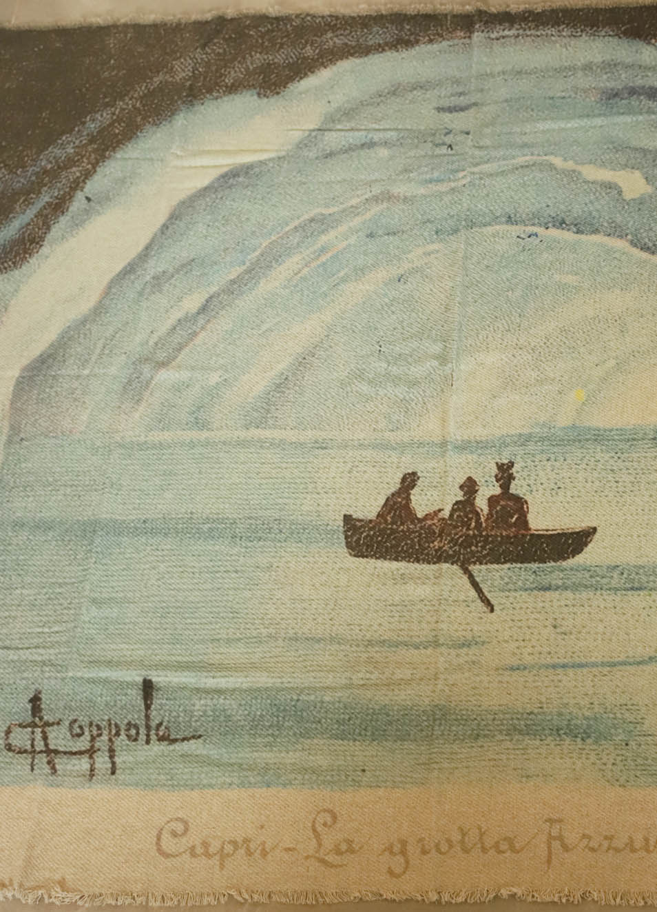 Exclusive Design: "Antique Postcard of Capri" print of the Blue Grotto with high-definition details, curated by the historic Laboratorio Capri tailoring shop.