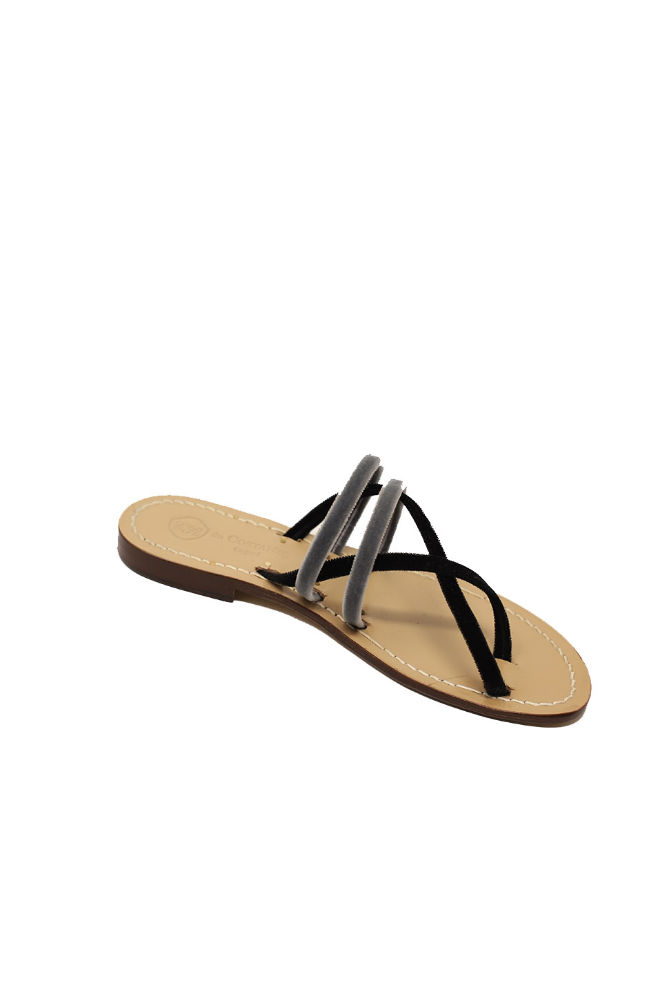 Lo stile caprese si sintetizza in queste piccole opere d'arte create nella bottega Da Costanzo sull'isola di Capri. Sandali capresi originali con le tradizionali campanelle portafortuna, per una calzatura che ama farsi notare sia in vacanza che in città.